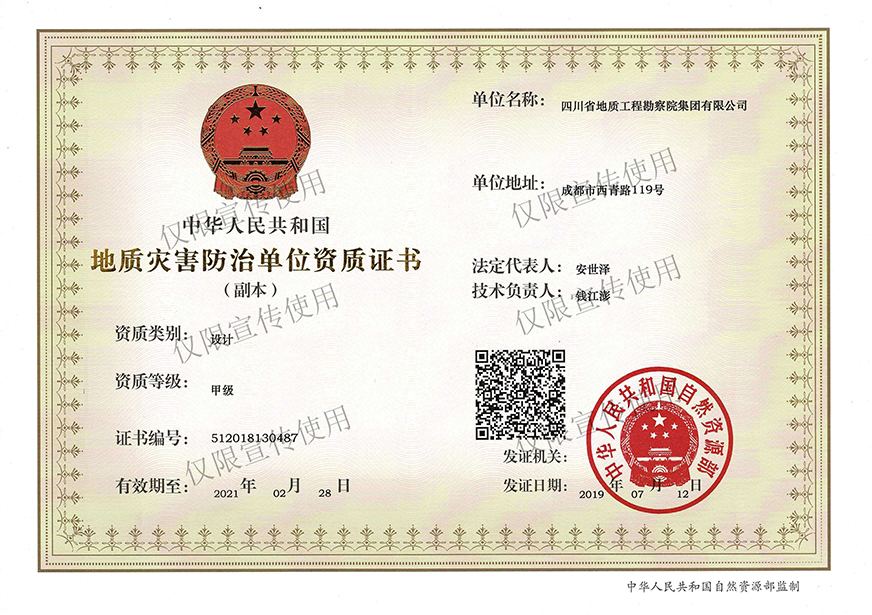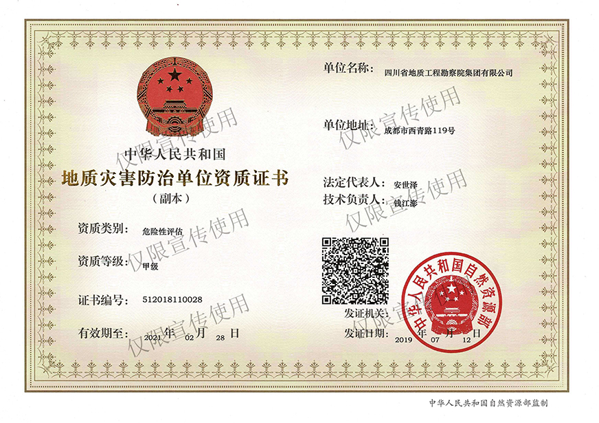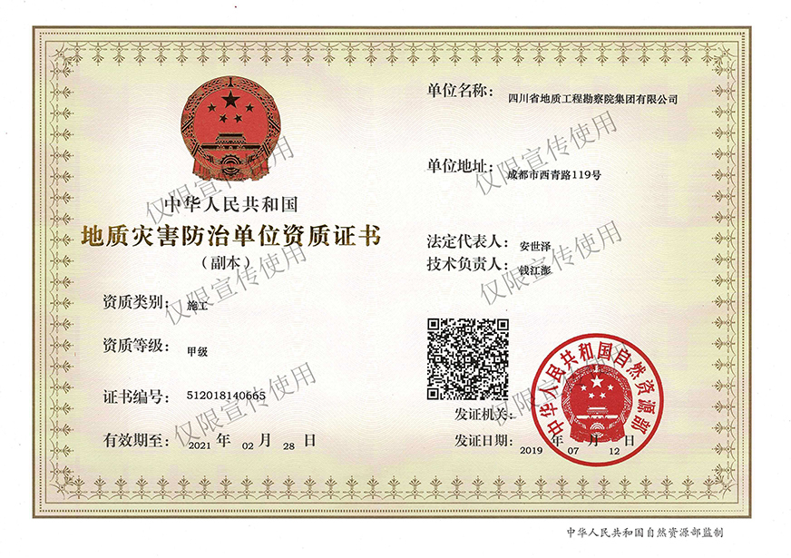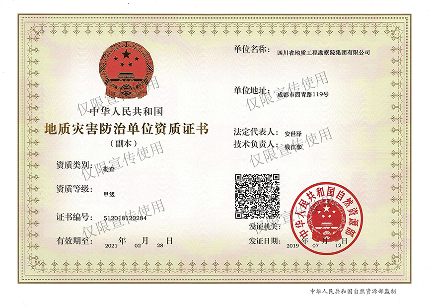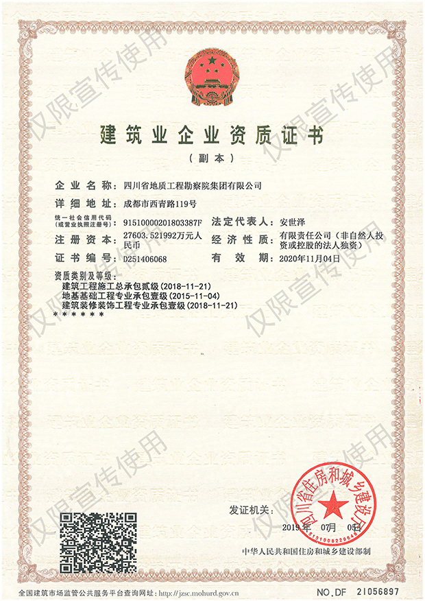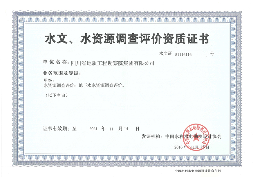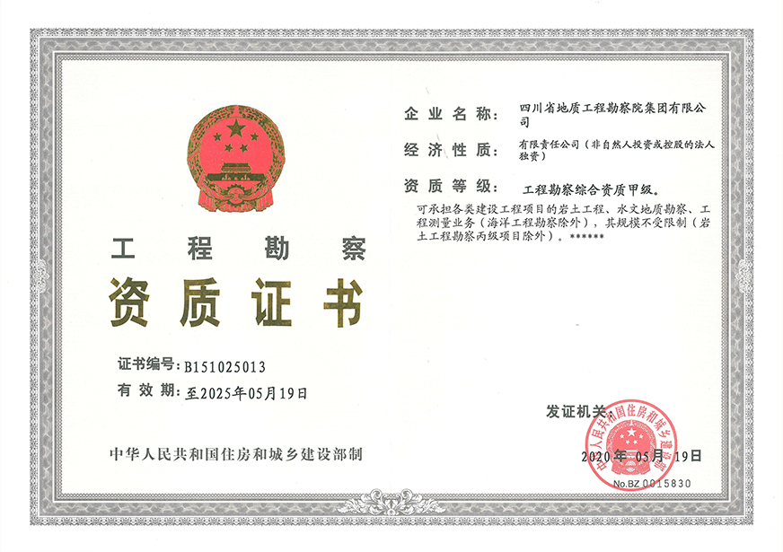 川勘集團擁有工程勘察綜合類,地質(zhì)勘查,測繪,地質(zhì)災(zāi)害評估和治理工程勘查設(shè)計、施工、監(jiān)理,城鄉(xiāng)規(guī)劃編制,水利行業(yè)設(shè)計,環(huán)境工程專業(yè)設(shè)計,水利水電工程、建筑工程、市政公用工程、公路工程施工總承包,地基基礎(chǔ)工程、建筑裝修裝飾工程、環(huán)保工程專業(yè)承包,檢驗檢測機構(gòu)(CMA),水資源論證,水文與水資源調(diào)查評價,土地規(guī)劃機構(gòu),四川省環(huán)境污染防治工程等級評價、地震安全評價等甲(壹)、乙(貳)級資質(zhì)、行業(yè)認(rèn)證30余項。
