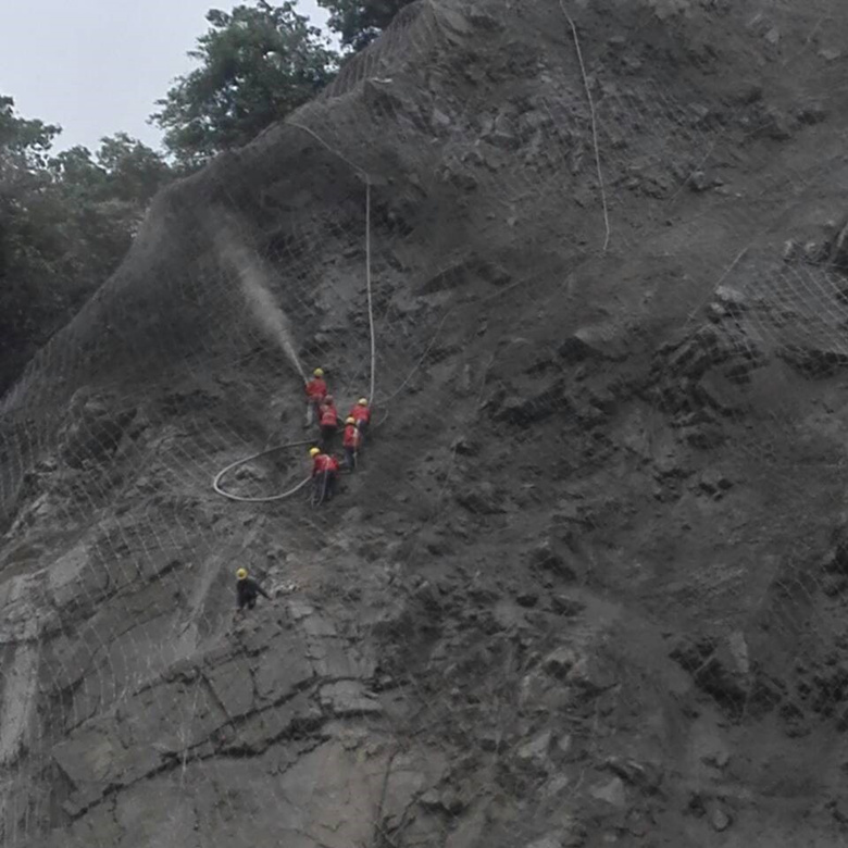項目組臨危不亂,發(fā)揮專業(yè)所長,迅速確定了滑坡應(yīng)急搶險實施方案:坡面清危+隨機錨桿淺層錨固+巖縫、凹槽注漿加固+表層淋漿硬化+GPS-2主動防護網(wǎng)防護+C20細石混凝土噴射,方案得到了現(xiàn)場專家組及相關(guān)單位的一致認同。搶險現(xiàn)場立刻成立了技術(shù)組、交通協(xié)調(diào)組、主動防護網(wǎng)安裝組、混凝土噴射組、材料二次搬運組、后勤組等小組,各司其職,各履其責(zé),緊急而有條不紊地按搶險方案開始施工。