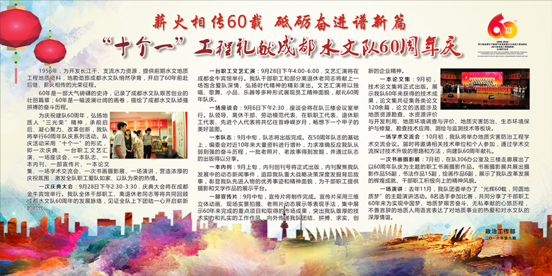 一次慶典大會(huì):9月28日下午2:30-3:30,慶典大會(huì)將在成都金牛賓館舉行。我隊(duì)全體干部職工、離退休老同志等將共同回顧成都水文隊(duì)60周年的發(fā)展脈絡(luò),見(jiàn)證全隊(duì)上下團(tuán)結(jié)一心開(kāi)啟嶄新的時(shí)代。