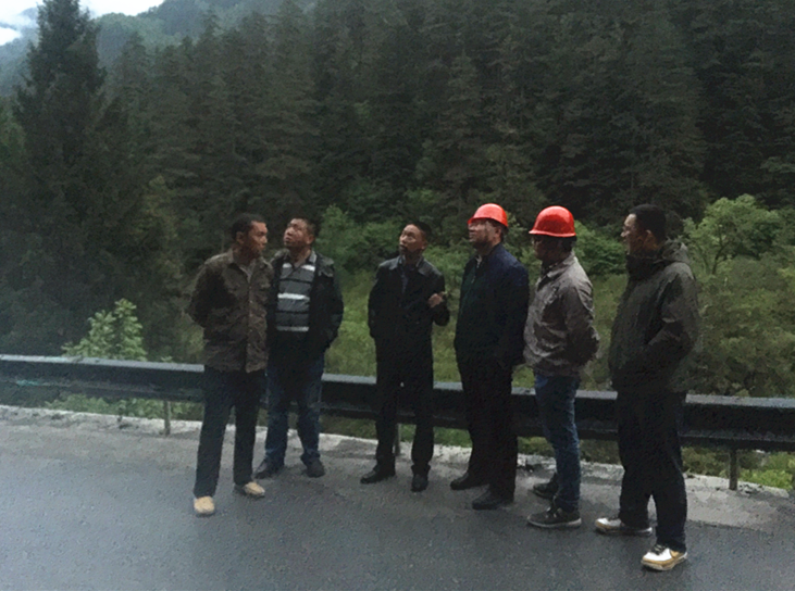 險(xiǎn)情發(fā)生后,九寨溝國(guó)家級(jí)自然保護(hù)區(qū)管理局劉春龍局長(zhǎng)、業(yè)主代表澤軍、我院九寨溝89處地災(zāi)治理項(xiàng)目部現(xiàn)場(chǎng)總協(xié)調(diào)人陳新、二標(biāo)段執(zhí)行經(jīng)理何海清緊急趕到現(xiàn)場(chǎng),共同商討對(duì)于該危巖的排危方案。