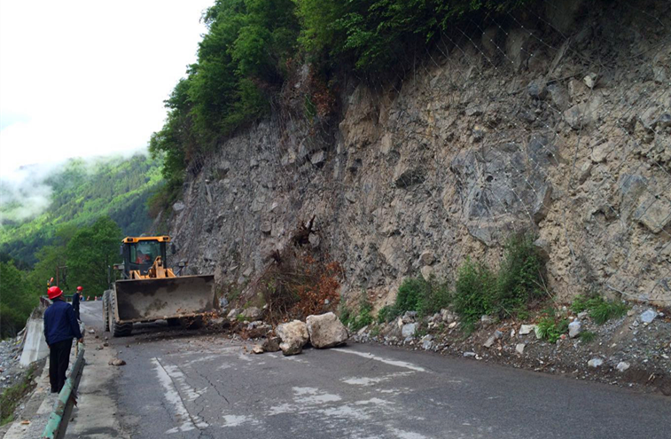 在管理人員的耐心指揮下,排危人員對(duì)坡面殘留的危石進(jìn)行了仔細(xì)地清除,在確定沒(méi)有松動(dòng)危石后,下部裝載機(jī)對(duì)路面堆積的土石體進(jìn)行了清理,我院管理人員協(xié)助路橋的交通指揮員,對(duì)積壓的車(chē)輛進(jìn)行了分批次放行,確保所有積壓車(chē)輛安全迅速地通過(guò)排危路段后,交通得到了恢復(fù),將現(xiàn)場(chǎng)的道路交通維護(hù)工作移交給四川路橋,結(jié)束了排危工作。