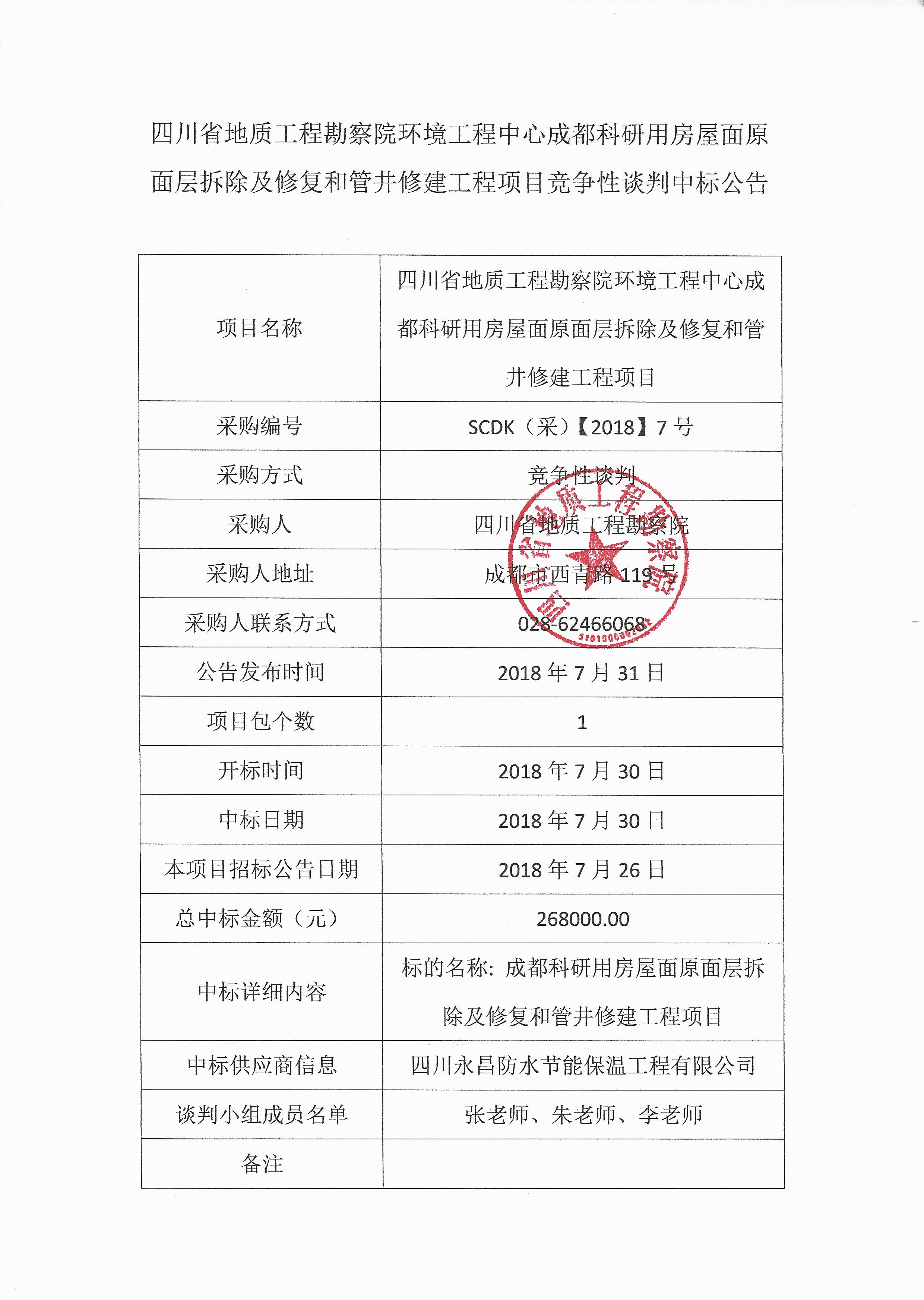 四川省地質工程勘察院成都科研用房屋面原面層拆除及恢復和管井修建工程項目競爭性談判中標公告